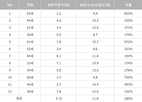 여성을 대상으로 60일간 EGF를 도포하였을 때, 모든 대상자들에게서 피부 자생력을 강화하는데 평균 285%, 최대 872%의 높은 증가율을 나타냈습니다.
